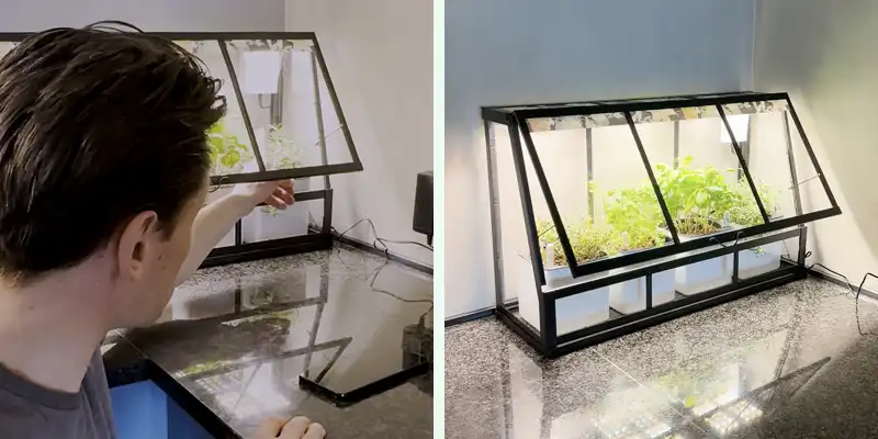 Buy IKEA’s Åkerbär greenhouse – both the large (65×40 cm) and small (45×35 cm) models work.