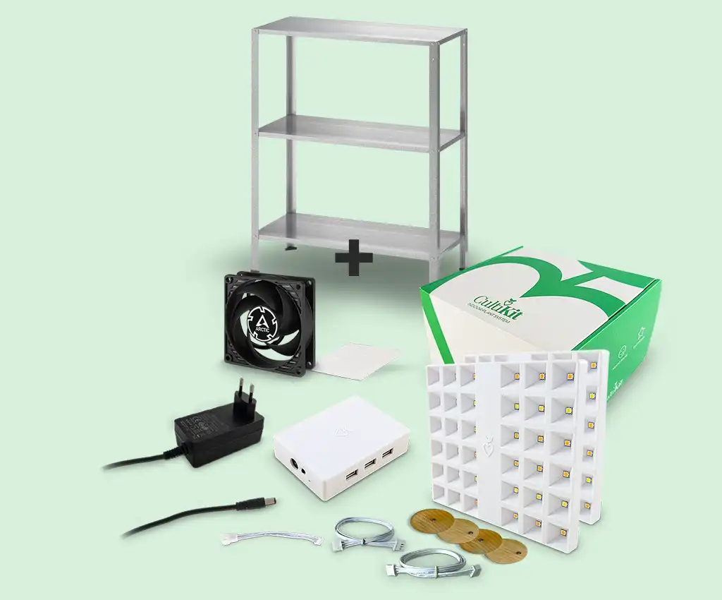 CultiKit is your Plug & Grow solution with efficient full-spectrum grow lights and low energy consumption. With CultiApp, you can easily control lights, fans, and pumps. Easy to integrate under shelves, in cabinets, bookcases etc. The only limit is your imagination.