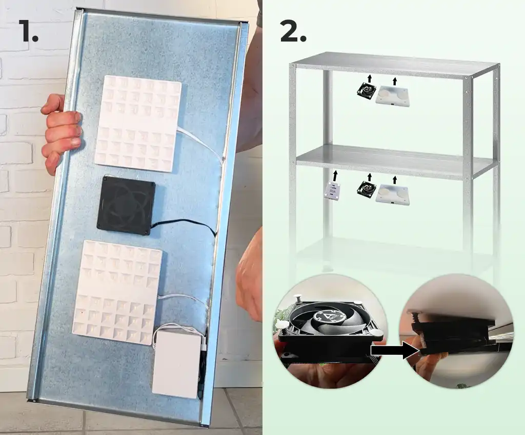 – 2 x fans (1 LED and 1 fan per shelf)